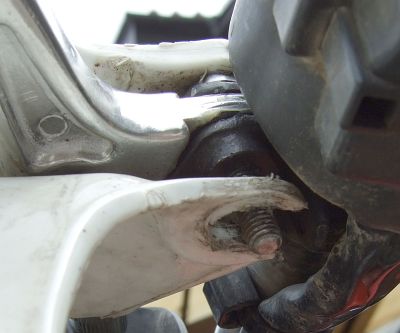 先日の林道ツーリングで破壊した、チェーンスライドを外します。