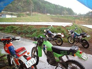 私は必死でKLX号について走りました。しかし、午前中は天気が良く、林道は砂埃が舞いやすいため全身埃まみれ・・・・