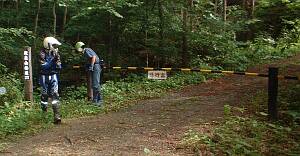 ここは、カーブの途中に雨による土流れ防止と思われるゴム製の板が埋め込んであり