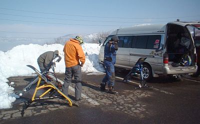 準備開始早速担いで、スキー場へ