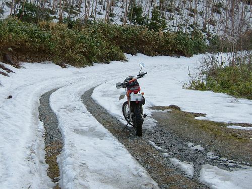 で、下って行くと回りに雪は無いし湯沢林道、下からな行けるかな?