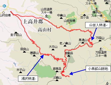 まずは、湯沢林道を上がり、小串鉱山跡地へ下り、山田入林道経由でベースへ戻る。