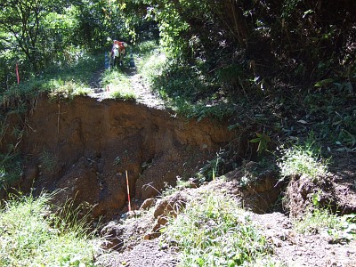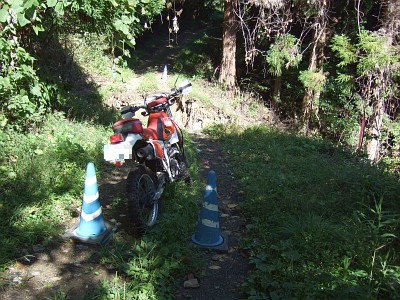で、林道桐宮線に入って、しばらく走ると、土砂崩れで道が・・・