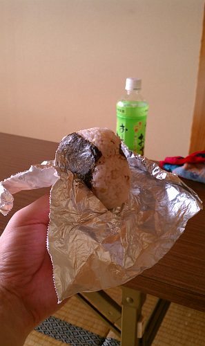 家に戻って、朝の残りご飯でおにぎりを作ります。具は鮭があったので・・・
