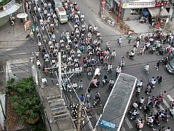 左の写真は滞在したホテルから見下ろした交差点の写真です。この交差点は信号機がありますので、このように渋滞してますが、このままの状態でいっしょに流れていると考えてもらってもよいです。右折は信号関係ないルールらしく外側から内側からどんどん曲がっていきます。また、信号の間隔も短く落ち着いて止