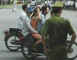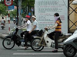 バイクに2人で乗ってるのは理解できますが、3人4人もあたりまえです。さすが大人4人乗りは見かけませんでしたが、運転者?の前に子供を乗せ(キャリヤが付いてる)、その後ろに2人乗ってる状態です。1歳位の子