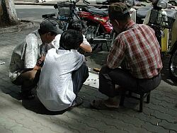この写真は、路上でゲームしている人たち。見たことない、将棋みたいなのでした。
